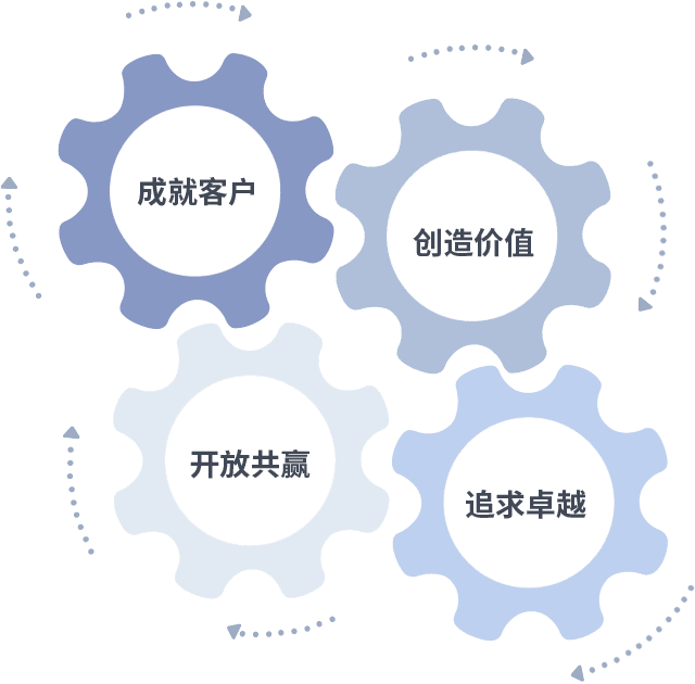 成就客户是一切决策的出发点,,,,创造价值是衡量所有工作的标准,,,追求卓越是我们做事做人的态度,,开放共赢是我们的格局也是最终的结果。。。价值观的齿轮环环相扣,,,,推动着组织里的每个人不断向前。。。