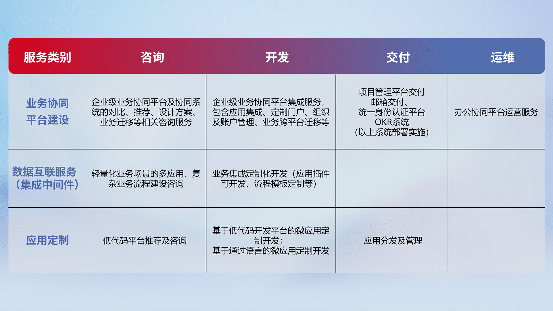 针对钉钉、、、企微、、IDaas等平台级产品提供产品的规划、、、、方案、、、、交付、、、定制化开发等服务,,,,实现如统一协同办公、、、、智能客户服务、、混合会议管理、、智能数据查询、、等业务场景,,,实现数字化转型。。。