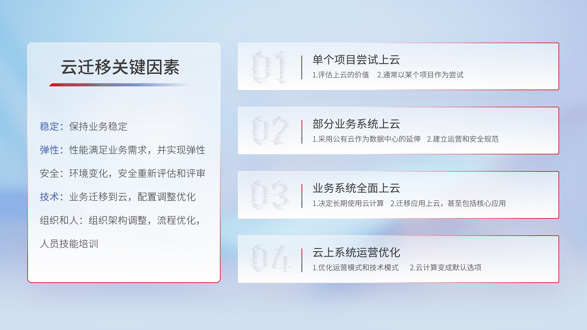 结合实际业务,,从规划设计、、、云平台选型、、、云原生改造、、、、数据迁移、、、集成交付,,,,迁移全过程为客户识别最佳上云路径,,,,做好风险识别管理,,,,设计网络架构、、、身份权限、、安全审计合规、、、、操作审计、、日志审计、、、监控告警策略、、、、多站点容灾设计等,,,对云上基础设施进行整体规划,,,提升IT治理水平,,以满足弹性、、、高可用、、、、高性能的需求。。。。