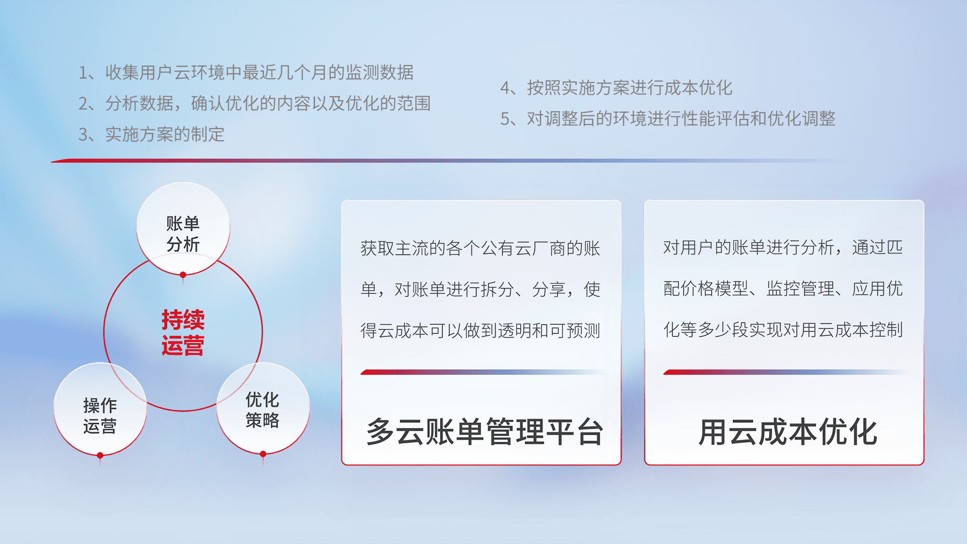 通过多云纳管,,,,以统一的资源数据模型把客户的云资源进行抽象和封装,,,进而实现对多云资源的统一操作,,,保障云资源管理的可靠性、、稳定性与可用性。。。量身定制化运维内容,,,,配置、、、、开发运维、、、、补丁管理、、、备份、、监控、、、、认证和访问管理、、、、审计和日常巡检等,,保障在用云过程中的可靠度,,,,稳定度以及高可用率。。。
